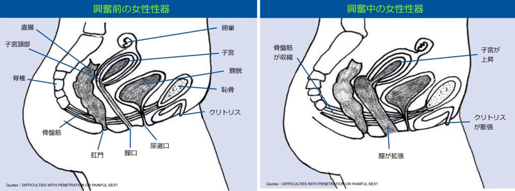 つまり、潤滑液の出が悪くなったり、膣が硬いままで伸びたりしなかったり、子宮が傾いて持ち上がらなかったりして、ペニスを受け入れる余裕が無くなる可能性があるということです。これらのうちの、何れかまたは全てが、女性がペニスを挿入されるときに痛みを感じる原因となる可能性があります。